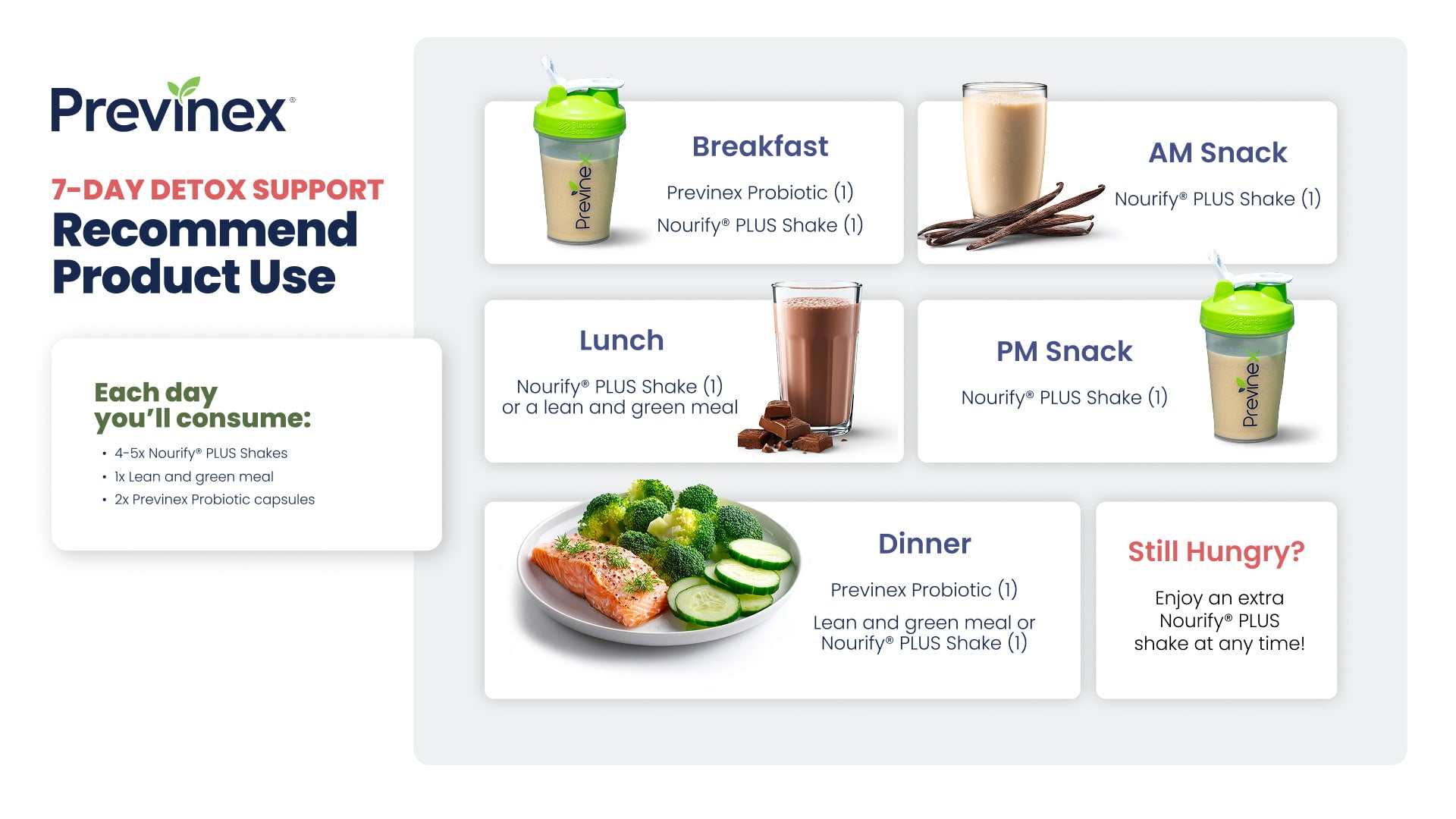 A one-week, science-backed program to reduce common dietary stressors, support digestion, curb cravings, and promote balance. The 7-Day Detox Support combines nutrient-dense Nourify® PLUS shakes, targeted gut support from Previnex® Probiotic, and a simple daily plan to support your body’s natural metabolic and digestive processes—no extremes or deprivation necessary. Perfect as a standalone nutritional support program or a first step before longer programs like the 21-Day Reset.